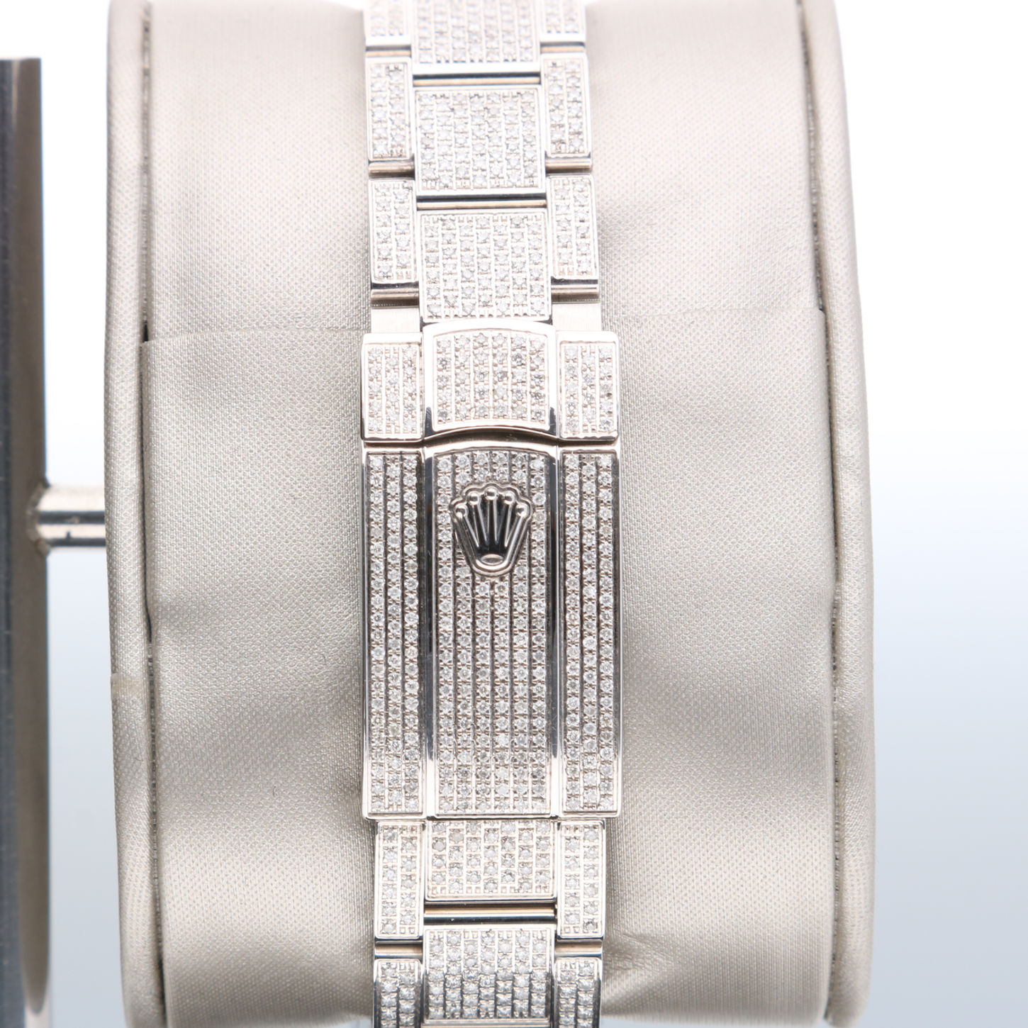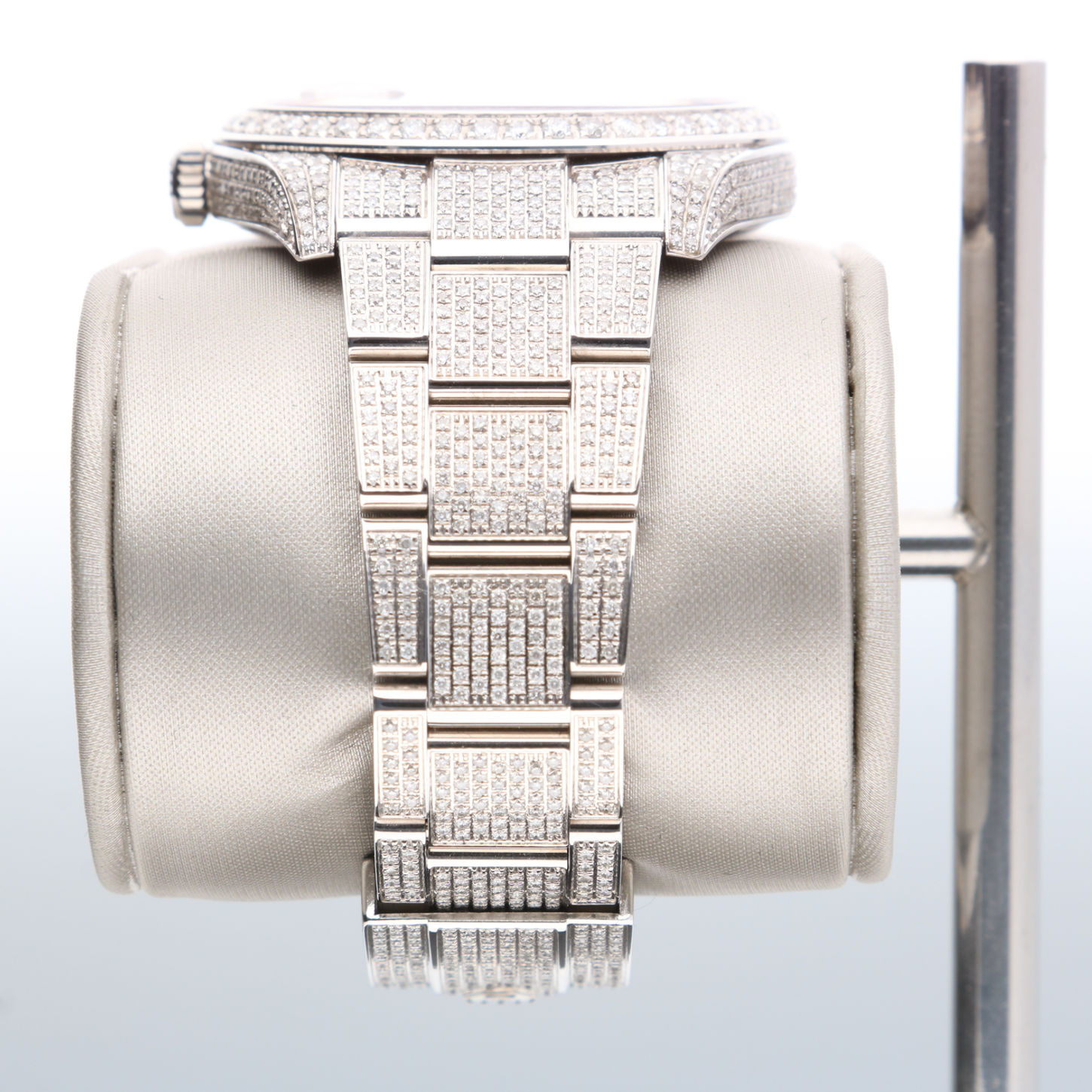 Personalizado com cravação aftermarket completa de diamantes, o relógio exibe um impressionante brilho contínuo — da caixa à pulseira — e um mostrador pavé com algarismos árabes aplicados em preto, que confere um toque de exclusividade e identidade marcante.