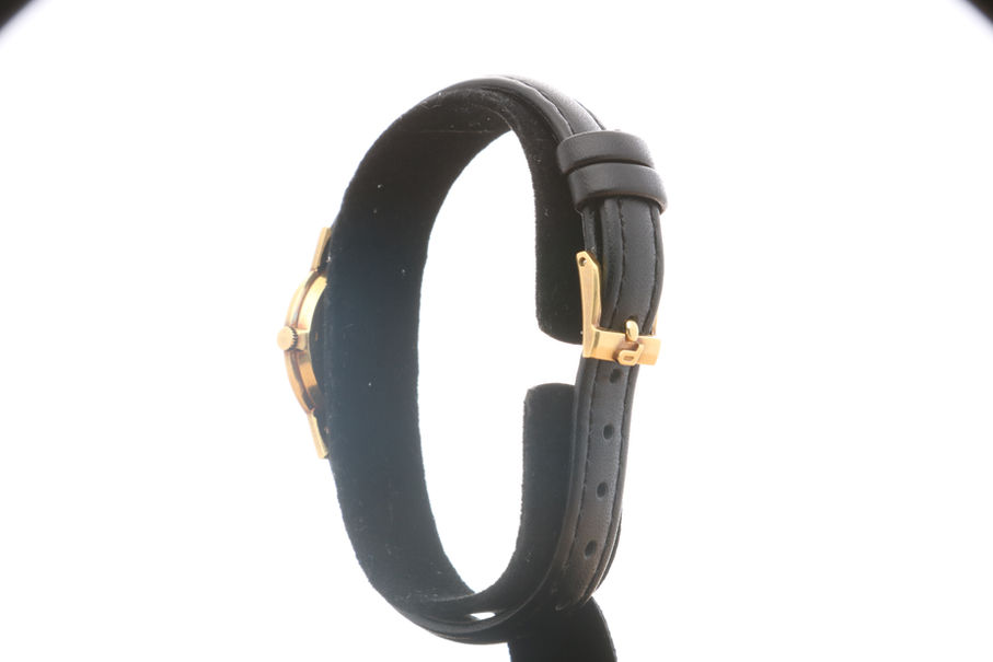 Compondo a elegância do conjunto, o mostrador exibe índices aplicados e ponteiros em tom dourado, acompanhados de uma pulseira em couro preto. O equilíbrio visual e o acabamento manual da caixa refletem a tradição Piaget de unir joalheria refinada e relojoaria de precisão — uma estética atemporal que tornou a marca símbolo de elegância discreta.
