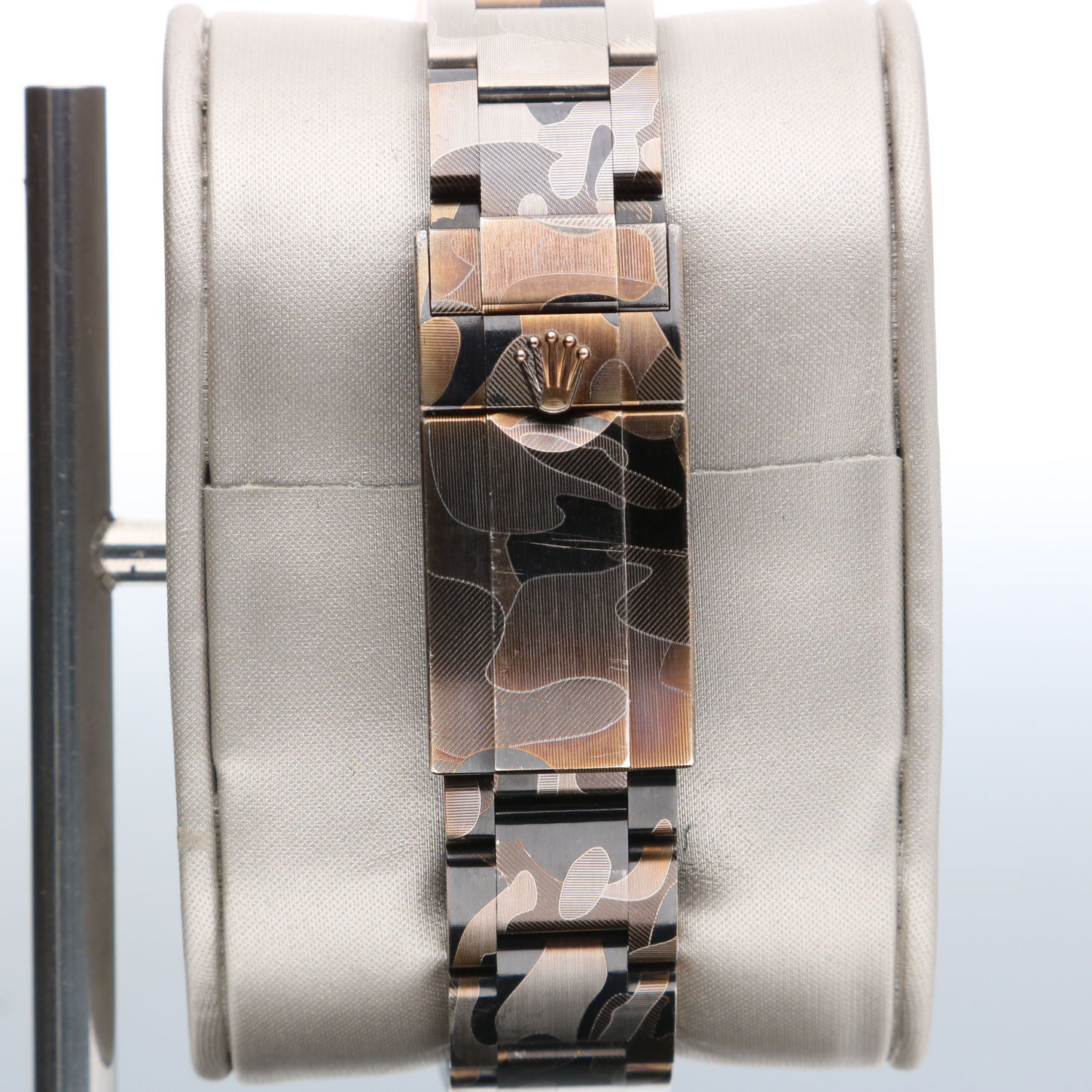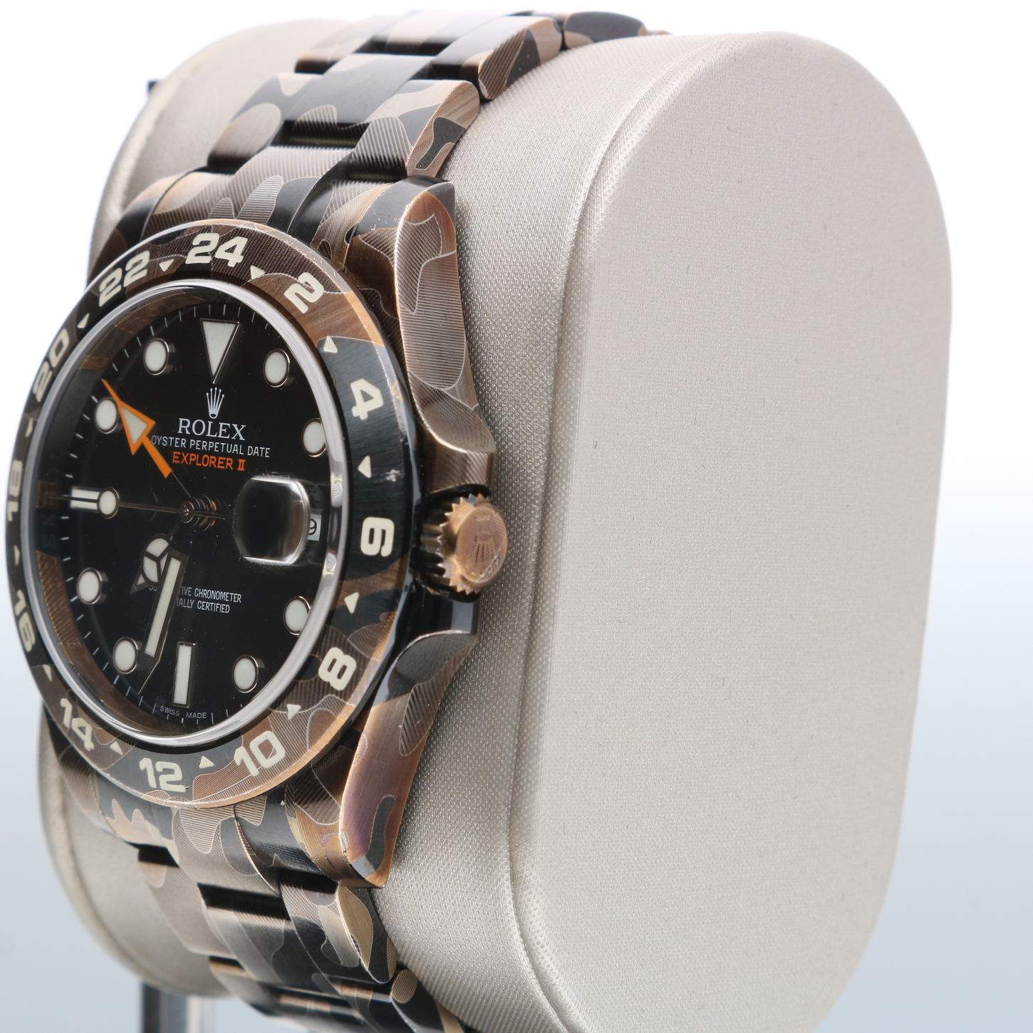 Este exemplar apresenta uma personalização contemporânea e ousada: um acabamento PVD camuflagem (aftermarket) aplicado sobre a caixa e a pulseira em aço inoxidável, resultando em uma estética moderna e exclusiva.